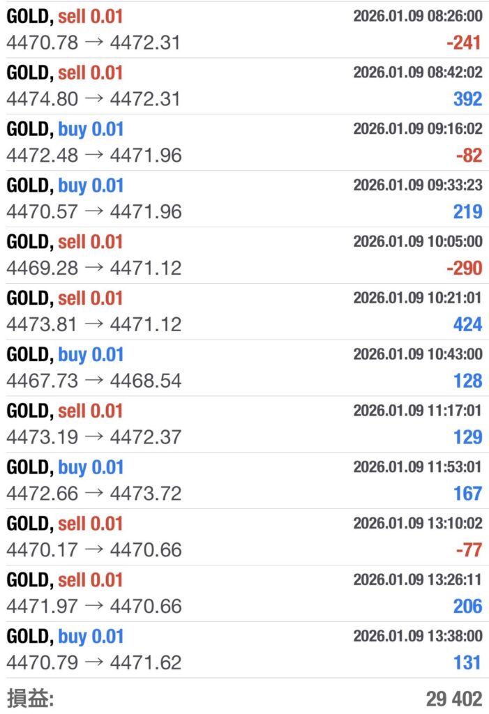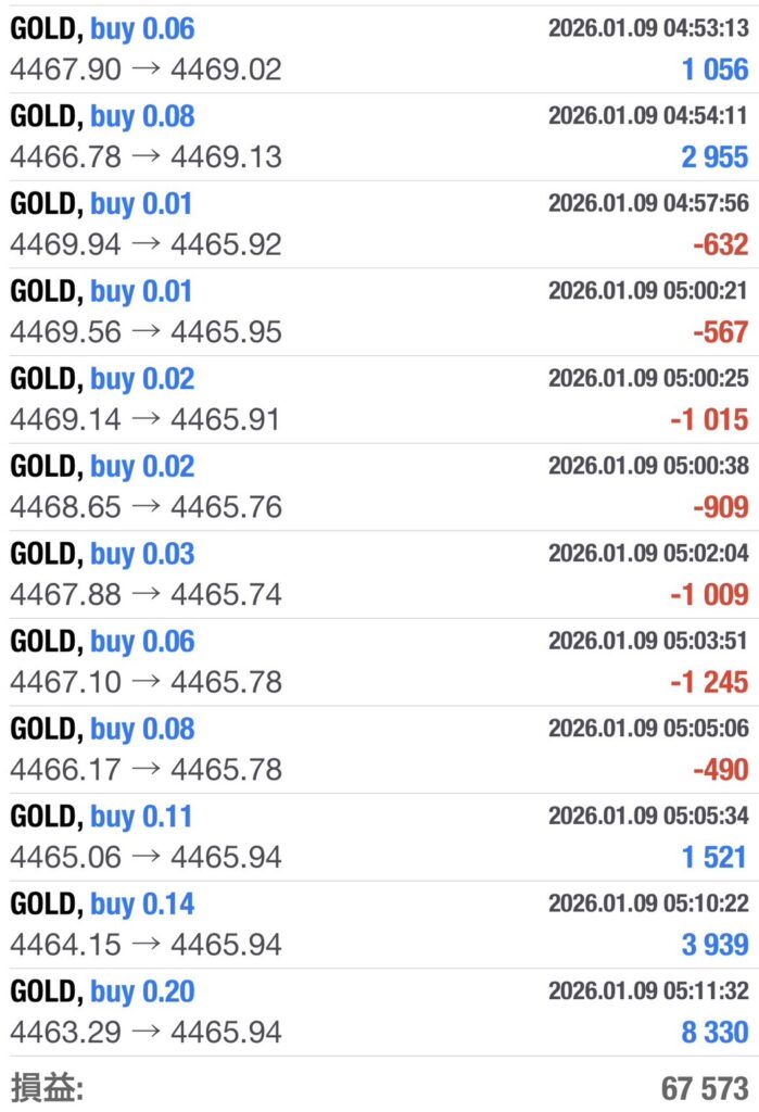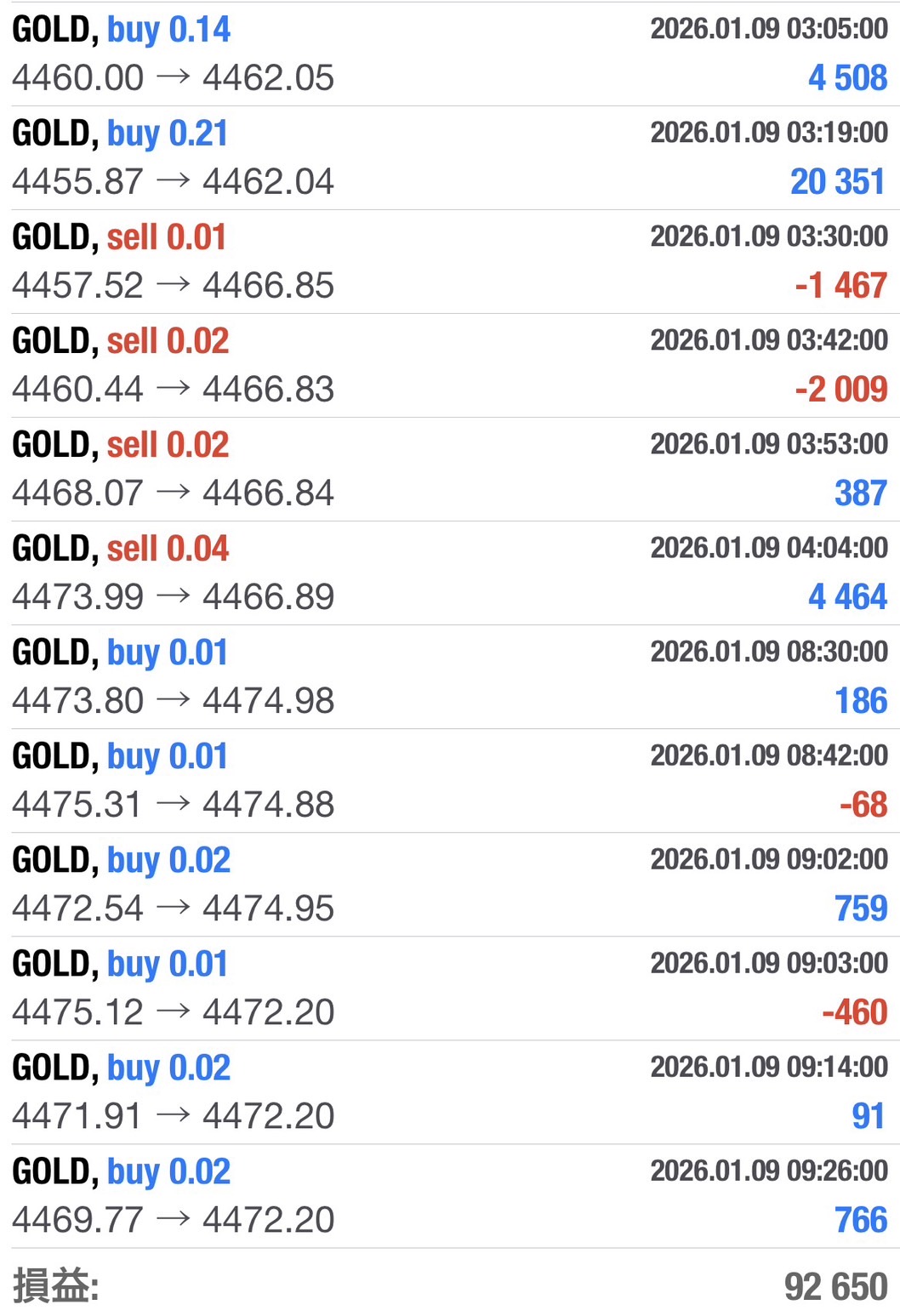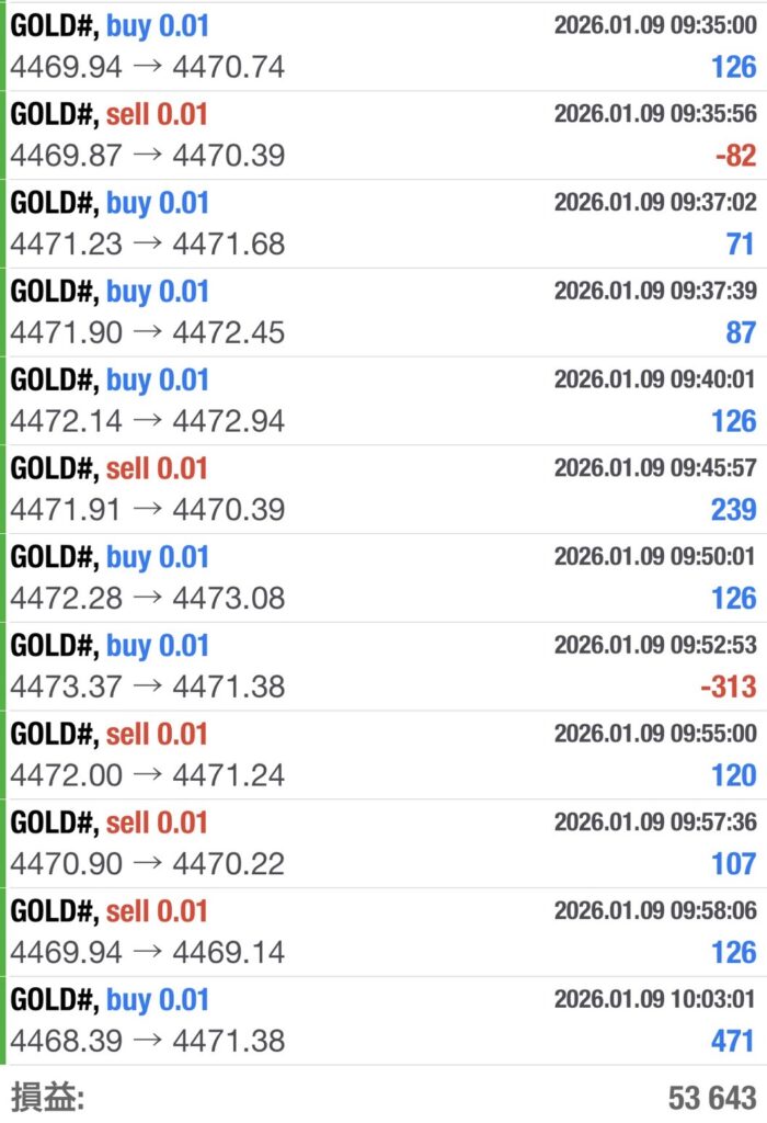 私のEAの戦場であるGOLDについて:米国によるベネズエラへの介入を受けて、金価格は相場格言のとおり「有事の金」として素直に上昇しました。先週まで懸念されていた事態が現実となり、資金が安心できる行き先を求めて金へと向かった形です。さらに、2026年にかけても続くとみられるFRBの利下げ局面を追い風に、金価格はこれまでとは一段違う局面へと歩み始めています。金曜の引けを見るに、やはり上昇トレンド継続を示唆していますね。