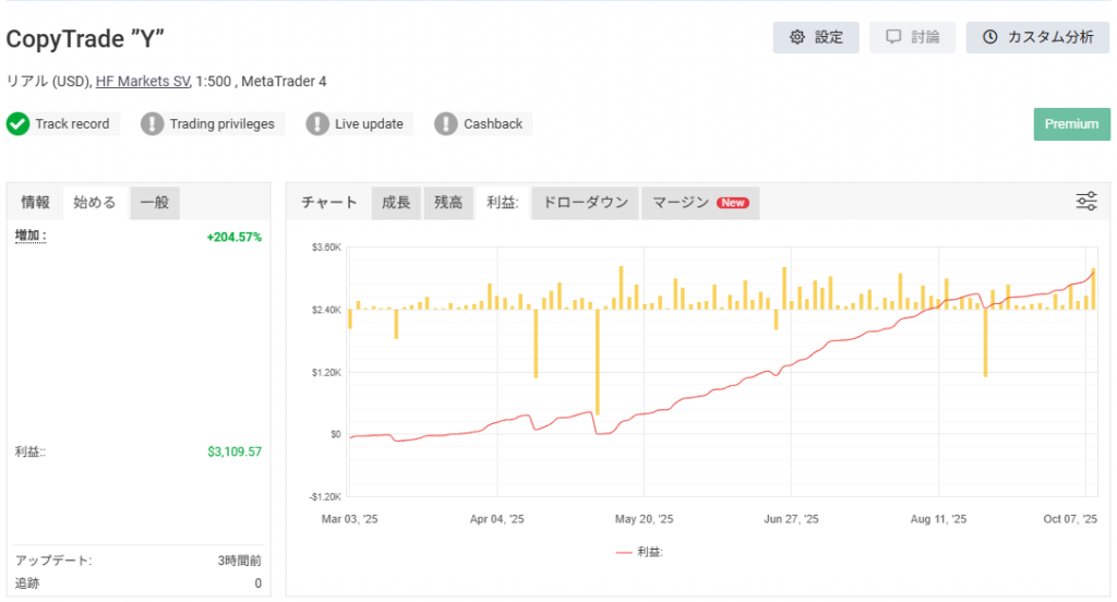私自身はですが、以前は証券会社のコピトレというと詐欺まがいや低質ストラテジーの氾濫など、大切なお金を預けるに及ばないと思いスルーを決めていました。が、この”Y”に出会ってからは何か違うものを感じ、思い切って当初$1000スタート。